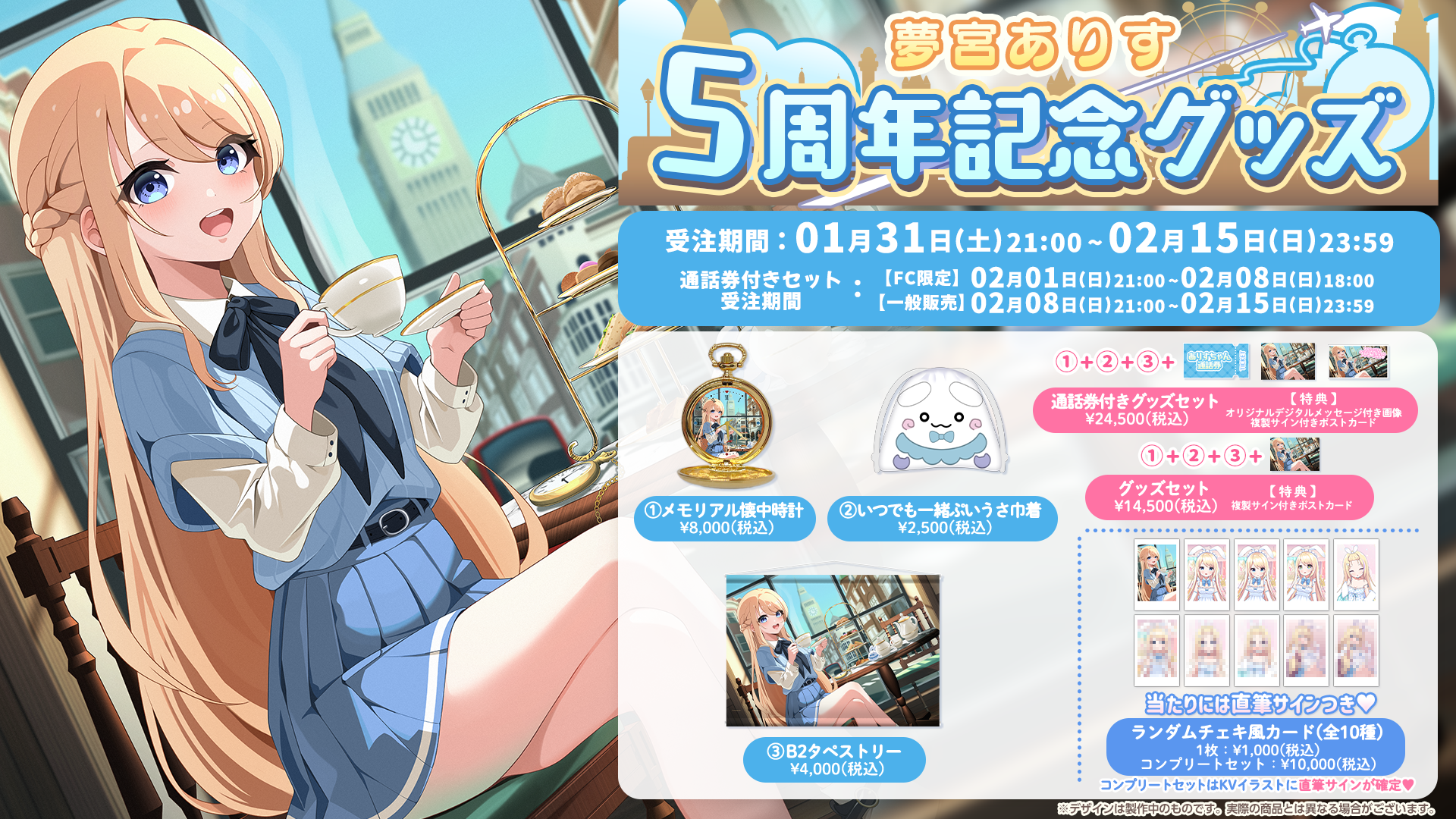 先日突然の活動一時休止で驚かせてしまいましたが、ご主人様への愛とありすちゃんがた〜っぷり詰まった5周年メモリアルグッズを是非お迎えください❤️